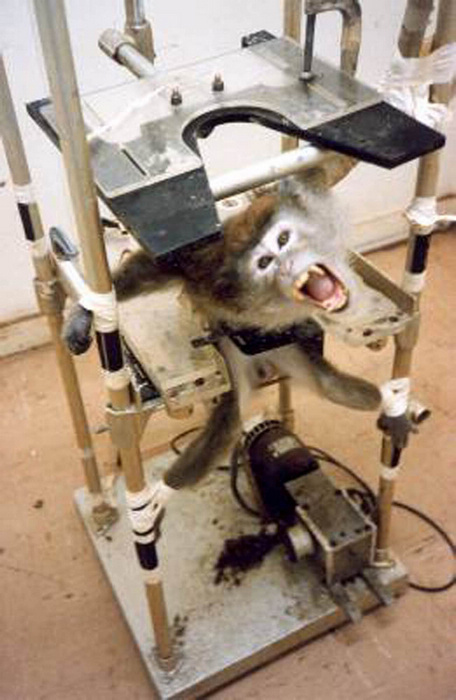 固定仪上的一只猿猴,这种固定仪由Dr.edward taub发明来做神经学实验,Dr.taub是唯一被审判并宣判其虐待动物的动物实验者。后来,他经由上诉而免罪,因为他在法律上钻漏洞:他的实验并不在动物保护法令的管辖范围内。